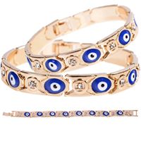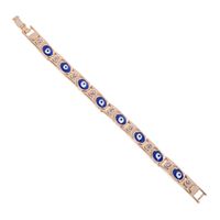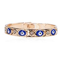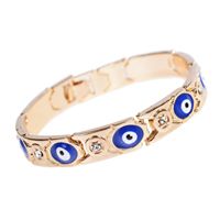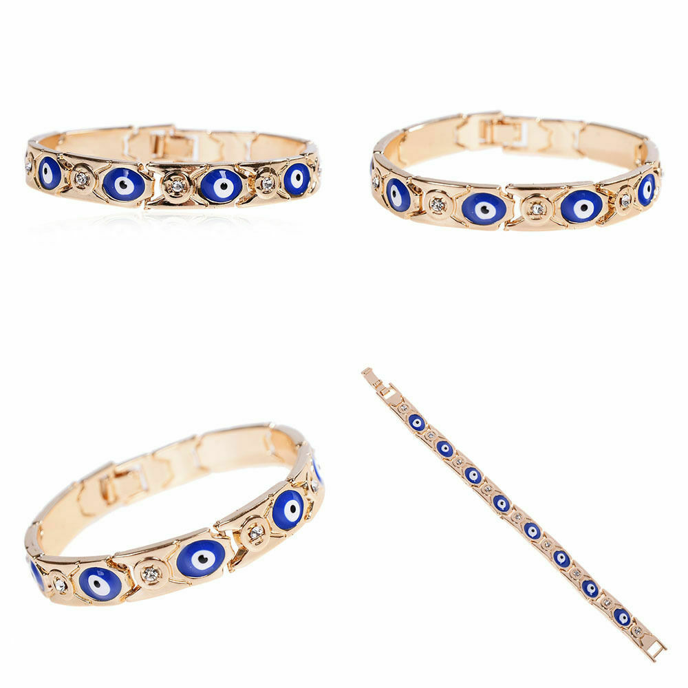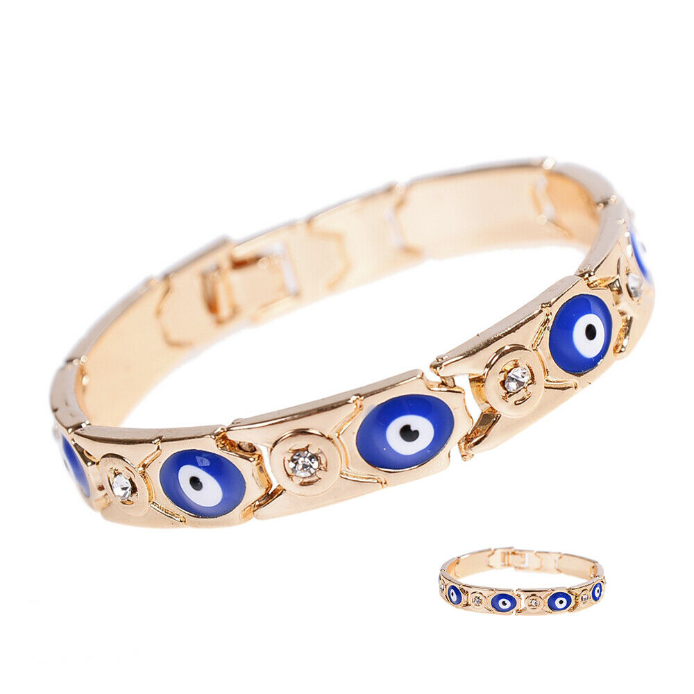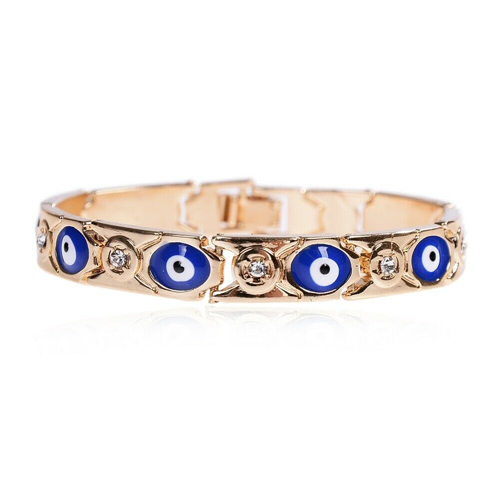 Γυναικείο μοντέρνο βραχιόλι για το κακό το μάτι. Κατασκευασμένο από ατσάλι με επιμετάλλωση κίτρινου χρυσού 14 καράτια. Διακοσμημένο με σφυρήλατα στελέχη και καστόνια με χρωματιστά, διαδοχικά τοποθετημένα εννέα (9) μπλε ζωγραφιστά κρύσταλλα ¨ματάκια¨ (τύπου vitraux) και δέκα (10) λευκά ζιργκόν σε κοπή round. Μήκος βραχιολιού 19 εκατοστά. Τιμή 17 ευρώ. Κωδικός FG102