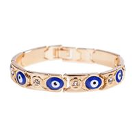 Γυναικείο μοντέρνο βραχιόλι για το κακό το μάτι.Γυναικείο μοντέρνο βραχιόλι για το κακό το μάτι με επιμετάλλωση κίτρινου χρυσού 14 καράτια. Διακοσμημένο με σφυρήλατα στελέχη και καστόνια με χρωματιστά, διαδοχικά τοποθετημένα εννέα (9) μπλε ζωγραφιστά κρύσταλλα ¨ματάκια¨ (τύπου vitraux) και δέκα (10) λευκά ζιργκόν σε κοπή round. Μήκος βραχιολιού 19 εκατοστά. Τιμή 17 ευρώ. Κωδικός FG102